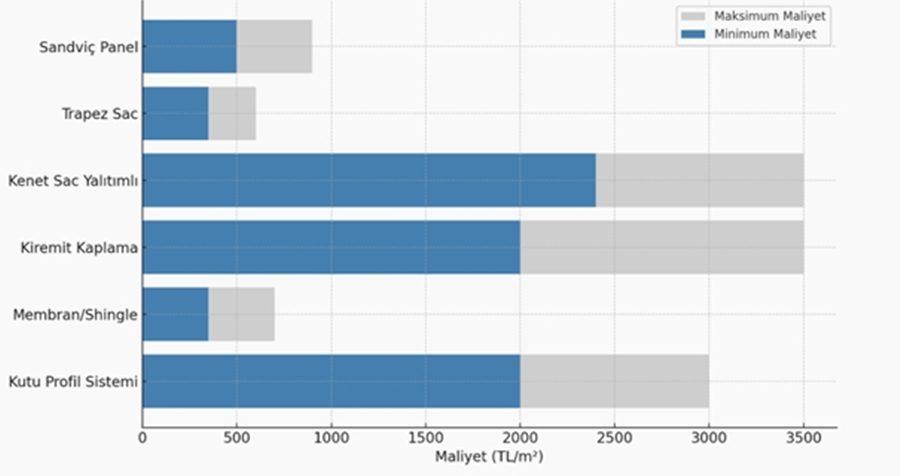 - Kutu Profil Taşıyıcı Çatı Sistemi: 2.000 – 3.000 TL/m²